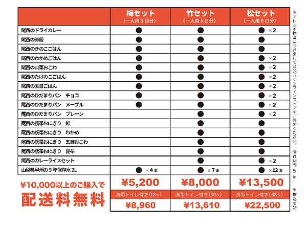 このセットには非常食の中で最も人気の高い「尾西食品」を使用しております。